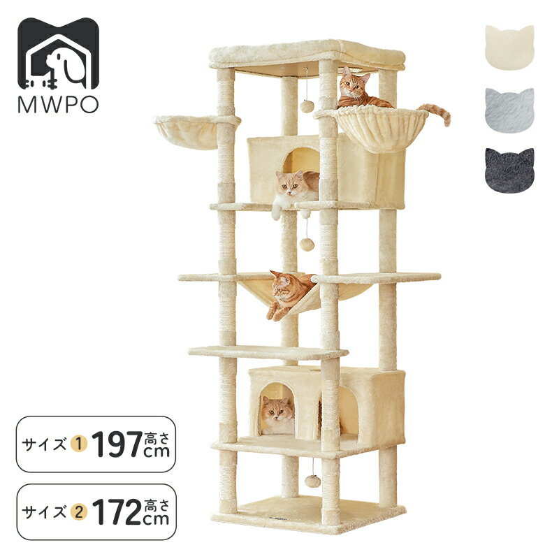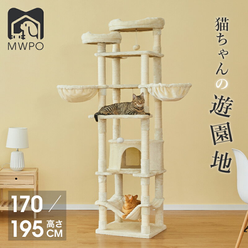 【15%OFF&スーパーセール限定】MWPO キャットタワー ハンモック 二つの高さ 195cm 170cm 多頭飼い 猫タワー 猫 キャット タワー 猫用品 据え置き 匂いなし 大型猫 爪とぎ おもちゃ ハウス 室内 mwpo-266