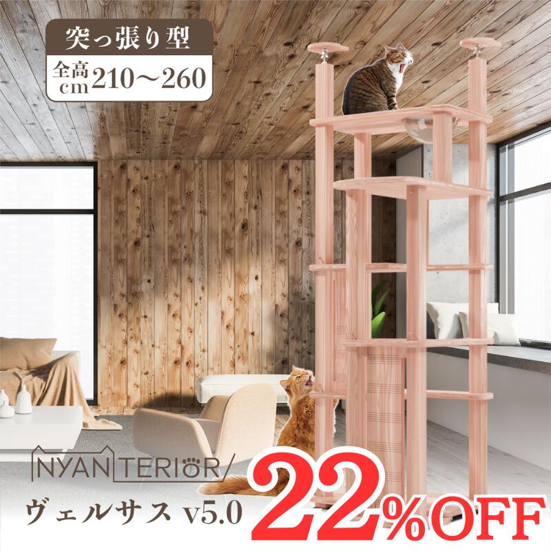 TBSねこ自慢で紹介 キャットタワー ニャンテリア【ヴェルサス 5段モデル】突っ張り 全高210-260cm 大型猫 天然木製 天日乾燥杉 森林浴効果 健康予防 フィトンチッド 消臭 抗菌 多頭飼い 爪とぎ 木登り 杉にゃん 高強度 人が乗れる 高耐久 一生使える