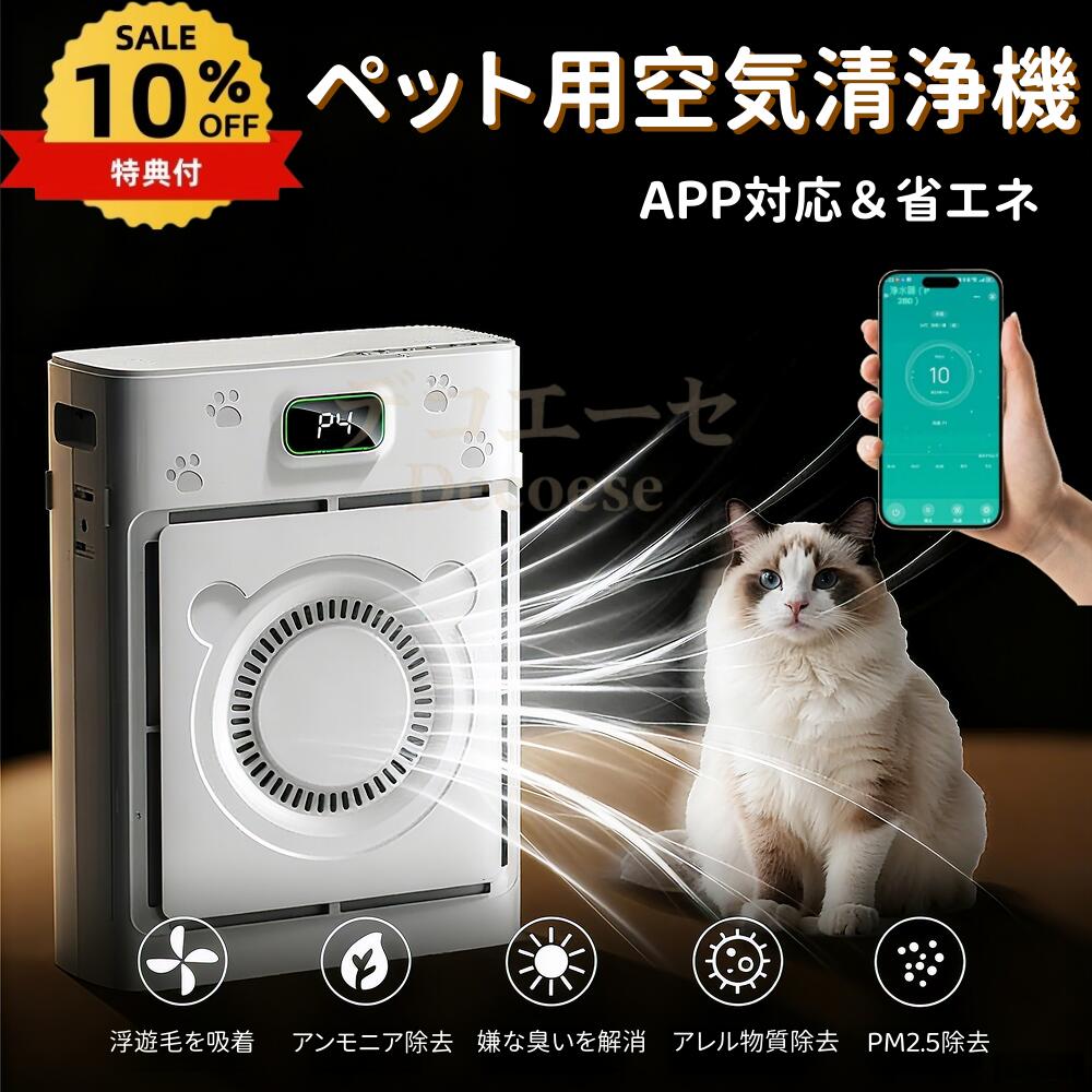 【10%OFFクーポン】ペット用空気清浄機 猫 犬 多頭飼い 浮毛 吸引 脱臭 アンモニア除去 花粉 PM2.5対応 静音 スリープモード 広範囲浄化 Hepaフィルター&高効率活性炭フィルター ペットの毛 コンパクト ホコリ・光センサー 除菌 脱臭 自動 ペットモード スマホ対応