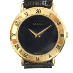 グッチ GUCCI 3000L 腕時計 ウォッチ クォーツ ローマン ラウンド レザーベルト 黒文字盤 ゴールド色 ■GY18 /MQ ■OH レディース