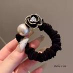ブラック シャネル風 ヘアゴム レディース 椿 パール ラインストーン シュシュ 高級感 ヘアアクセサリー 気質アップヘアゴム