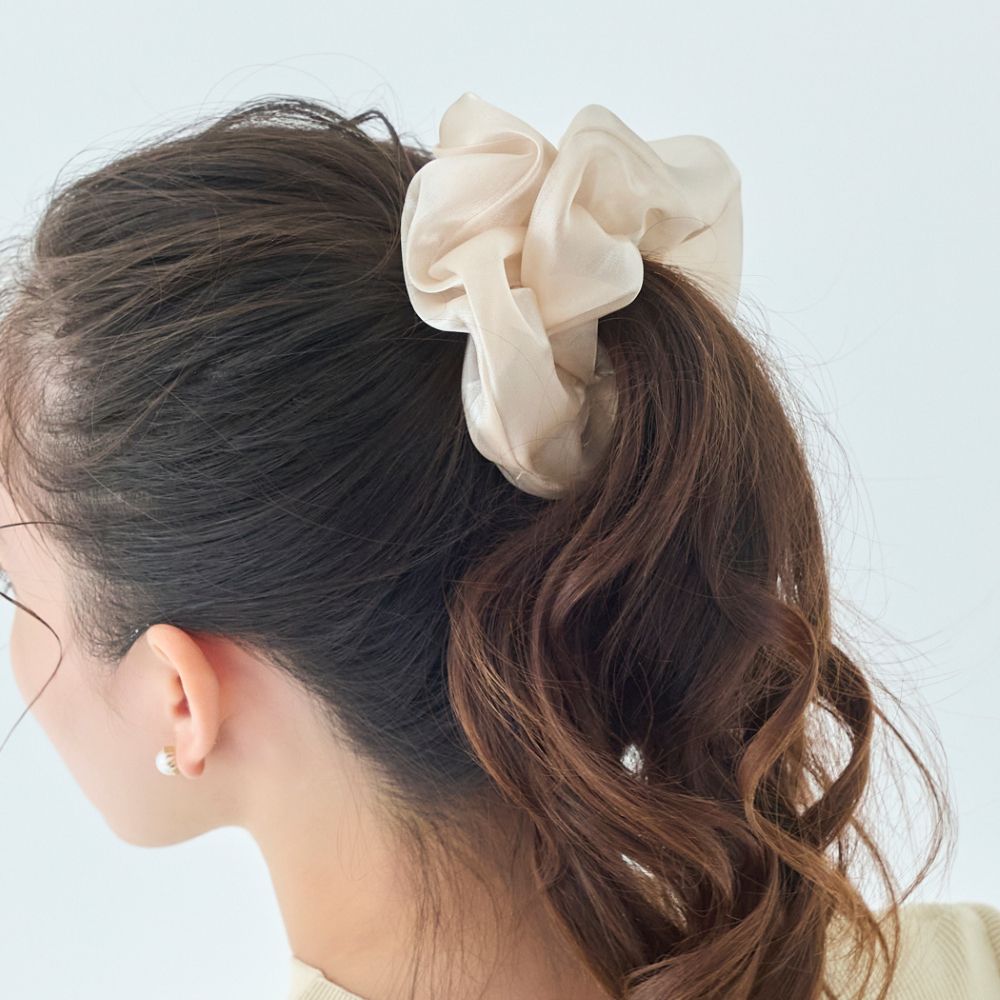 【本日限定★全品ポイント5倍】シュシュ 大人 ボリューム 大きめ オーガンジー素材 サテン調 ヘアアクセサリー ビッグシュシュ 大人 上品 エレガント シンプル フェミニン 黒 ブラック ベージュ グレー ネイビー カーキ キャメル