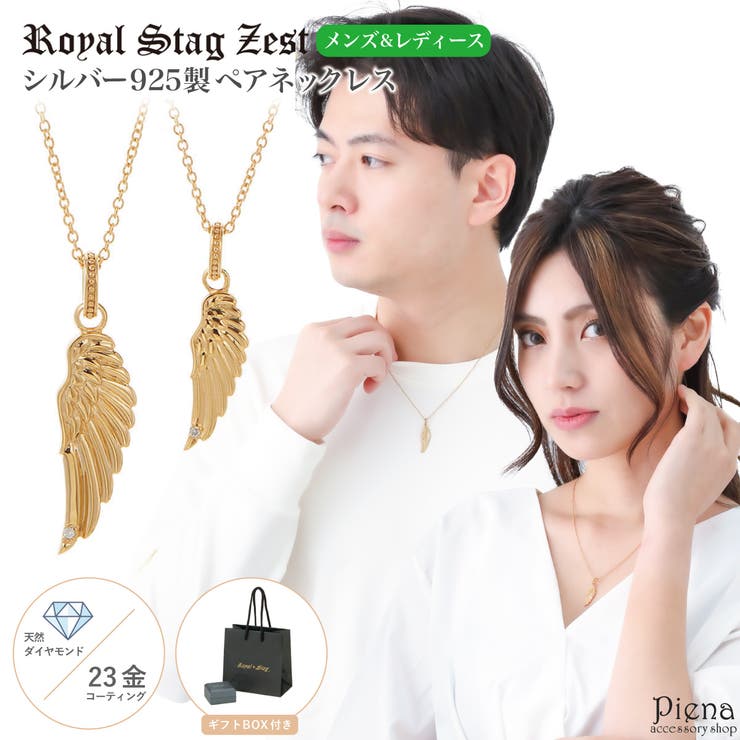 【10%OFFクーポン!2/10(火)1:59まで】アクセサリーショップPIENA ペアネックレス レディース メンズ シルバー925製 ダイヤモンド K23コーティング Royal Stag Zest 翼 羽根 フェザー 1粒 ワンストーン ゴールド