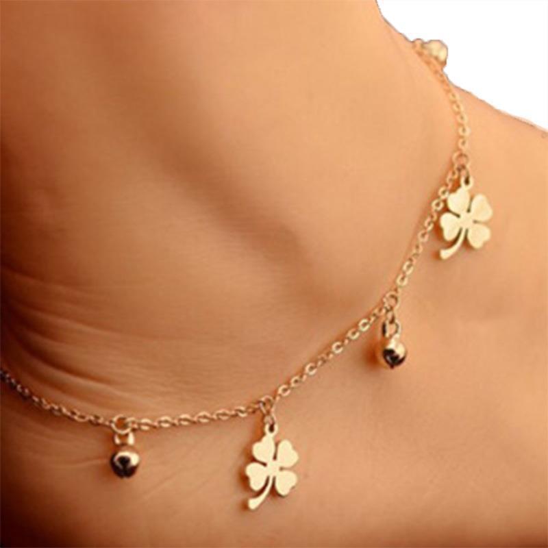 アンクレット レディース 金メッキ 合金製 四つ葉のクローバー モチーフ 3つ鈴付き 華奢 上品なデザイン ナチュラル カジュアル 揺れる足元アクセサリー デイリーユース