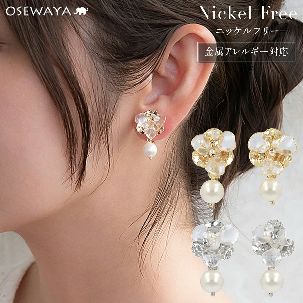Classy イヤリング ニッケルフリー メタル ワイヤー フラワー 半透明 パール ビーズ ネジバネ式イヤリング | OSEWAYA アクセサリー レディース 女性 大人 プレゼント ギフト 結婚式 誕生日 おしゃれ オシャレ かわいい