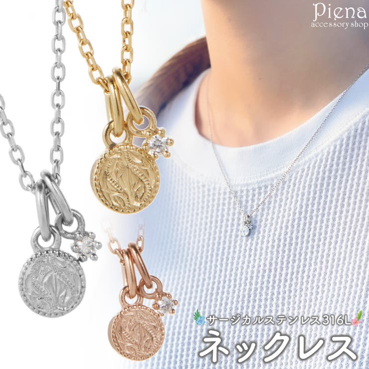 【10%OFFクーポン!2/10(火)1:59まで】アクセサリーショップPIENA ネックレス ペンダント レディース サージカルステンレス316L製 1粒とコイン ラウンド ワンストーン ハワイアンジュエリー ハワジュ 波 スクロール お肌に優しい 金