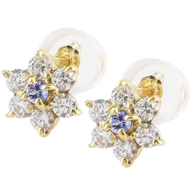 [スーパーセール10%OFF][ポスト太め0.9ミリ] 18金 ピアス ダイヤモンドピアス 花 フラワー ピアス タンザナイト イエローゴールドk18 18k スタッドピアス 天然石 ダイヤ 12月誕生石 レディース 男女兼用 ユニセックス 男女問わず