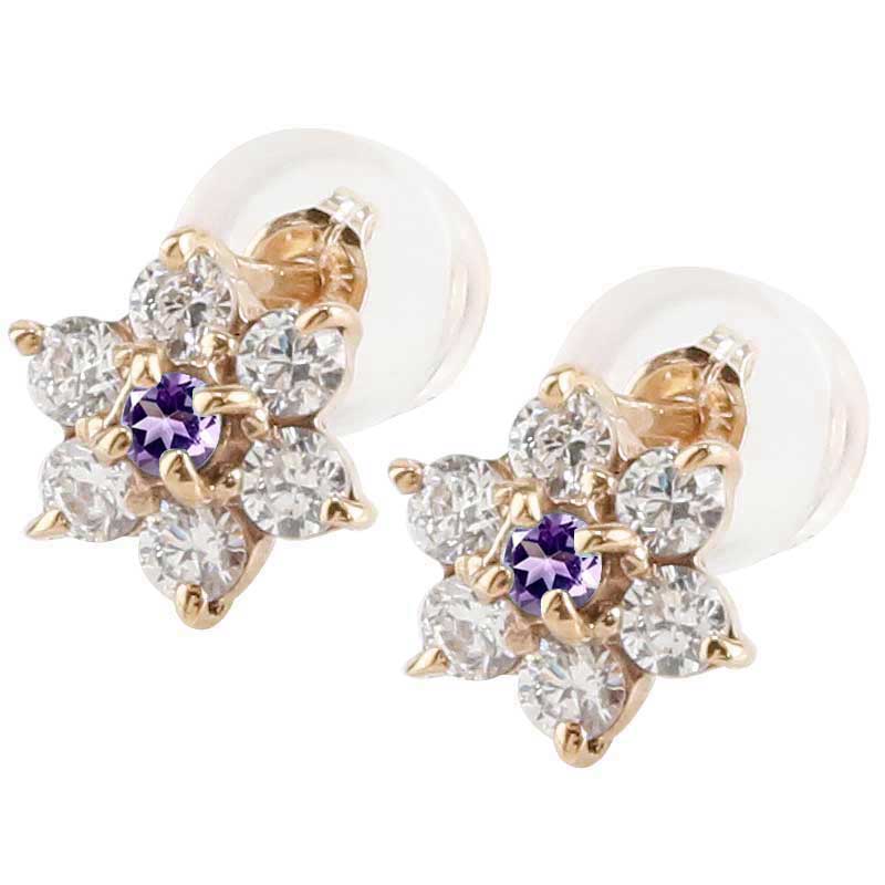 [スーパーセール10%OFF]18金 ピアス レディース 女性 妻 彼女 ダイヤモンドピアス 花 フラワー ピアス アメジスト ピンクゴールドk18 18k スタッドピアス 天然石 ダイヤ 2月誕生石