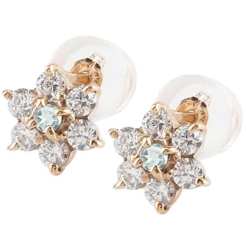 [スーパーセール10%OFF][ポスト太め0.9ミリ] 18金 ピアス レディース 女性 妻 彼女 ダイヤモンドピアス 花 フラワー ピアス アクアマリン ピンクゴールドk18 18k スタッドピアス 天然石 ダイヤ 3月誕生石