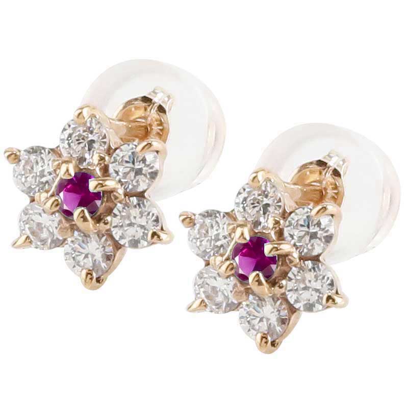 [スーパーセール10%OFF]18金 ピアス ダイヤモンド ルビー ピアス ピンクゴールドk18 花 フラワー スタッドピアス レディース 天然石 ダイヤ 7月誕生石 レディース 男女兼用 ユニセックス 男女問わず
