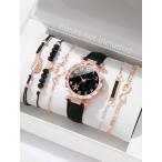 レディース ファッション PUレザーバンド クォーツ 腕時計 ブレスレットセット、ラインストーン付き花弁デザインダイヤル (6点セット) 学生への贈り物