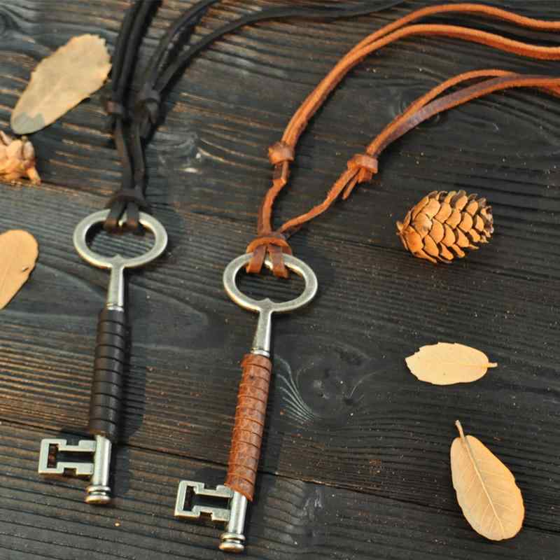 ネックレス メンズ レディース 個性的 ビッグキー キーモチーフ ヴィンテージ レトロ 本革 レザーコード 電気メッキ加工 カジュアル おしゃれ 黒 茶色 ペンダントトップ