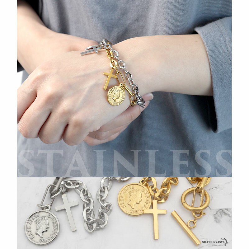 \スーパーSALE 10%OFF 2,750円→2,475円 /レディースブレスレット 小豆チェーン ステンレス マンテル 18kgp 金メッキ クロス コイン ゴールド シルバー gold silver あずき 十字架 エリザベス女王 金属アレルギー対応