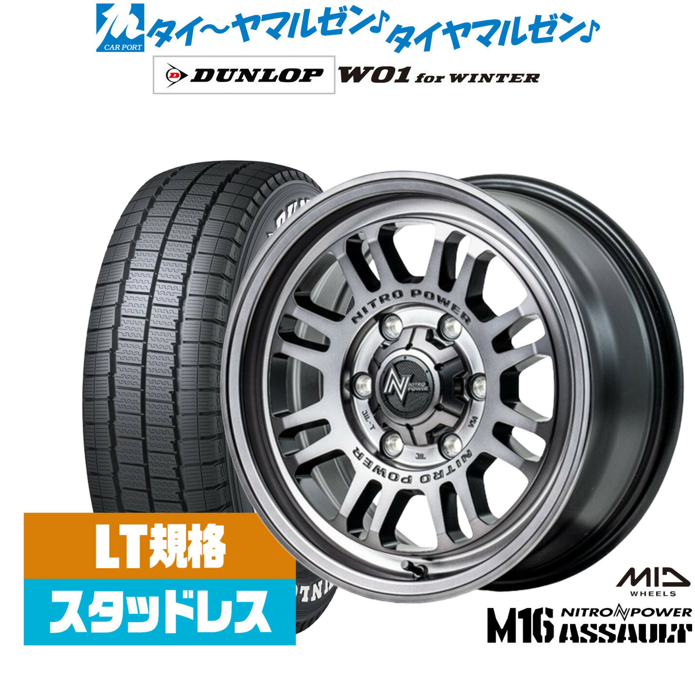 新品 スタッドレスタイヤ ホイール4本セットMID ナイトロパワー M16 アサルト15インチ 6.0Jダンロップ W01 for WINTER195/80R15