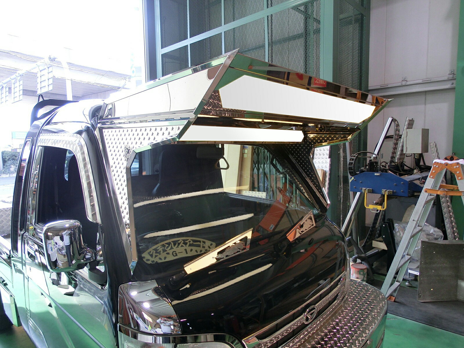 ダイハツ ハイゼットジャンボ フロントバイザー (2DK-600) アンドン付き サイドプレート角パイプ 鏡面シマイタ仕様