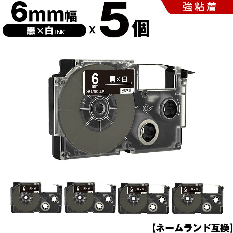 【全品ポイント20倍★10%OFF】 カシオ ネームランド XR-6ABK 6mm 黒テープ 白文字 強粘着 5個セット 互換テープ ラベル テープカートリッジ ネームランドテープ KL-H5 KL-880 KL-AZ1 KL-E20 KL-P7A KL-H10GN KL-H10BU KL-S20 KL-S10 KL-P7B KL-H20 EC-K10 EC-P10 EL-700