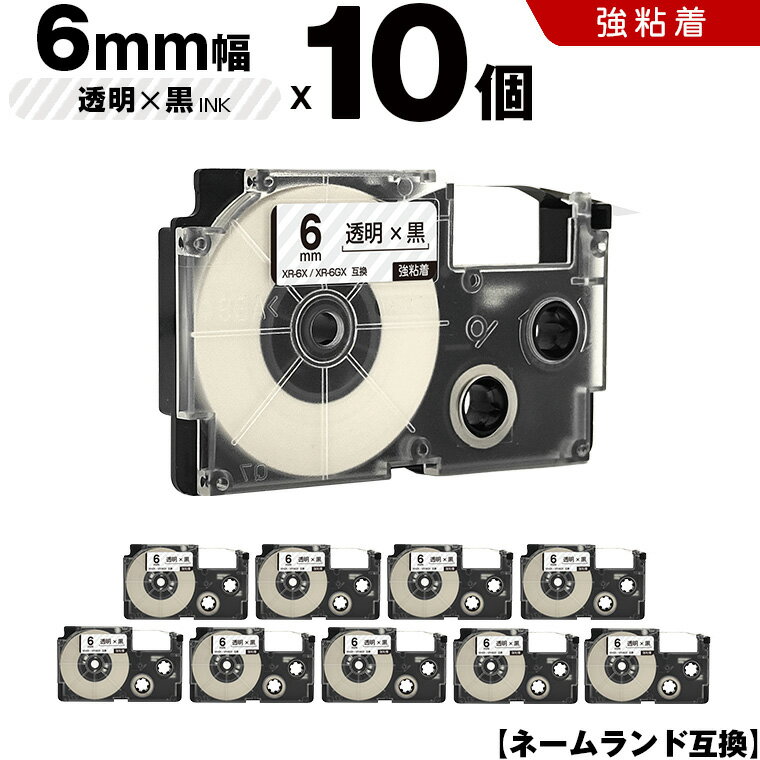 【全品ポイント20倍★10%OFF】 カシオ ネームランド XR-6X XR-6GX 6mm 透明テープ 黒文字 強粘着 10個セット 互換テープ ラベル テープカートリッジ ネームランドテープ KLD-350 KLD-300 KLD-200 KL-E11 KL-E300 KL-F10 KL-G2 KL-G1 KL-H25 KL-H20BGS KL-SP10-SA KL-SP10-PN