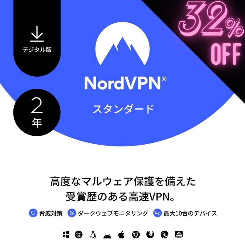 ★32%OFF★NordVPN スタンダードプラン 2年:サブスク型VPN & セキュリティ対策ソフト (10台のデバイスに対応) - マルウェア、 危険なサイト、広告をブロックして個人情報を保護 ノード ノルド 【 ダウンロード版 】