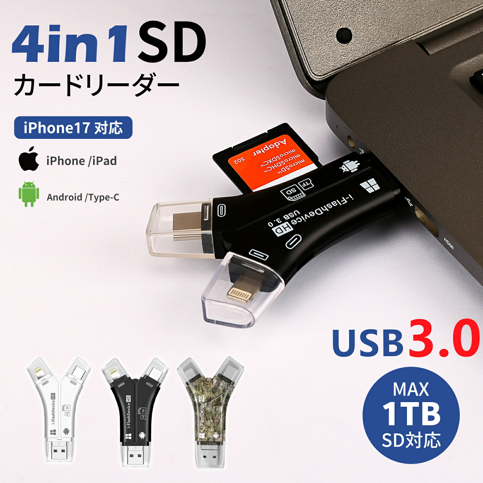 \期間限定 2点購入10%OFF/SDカードリーダー iPhone17 対応 1TB USB USBメモリ 外付け写真 動画 保存 移行 移動 容量 高速 スマホ データ転送 容量不足解消 外付けメモリ スマホ対応 OTG 4in1 SDカードカメラリーダー バックアップ