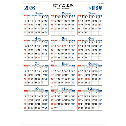 九十九商会 壁掛けカレンダー 数字ごよみ 2026年版 AA−066−2026 1冊