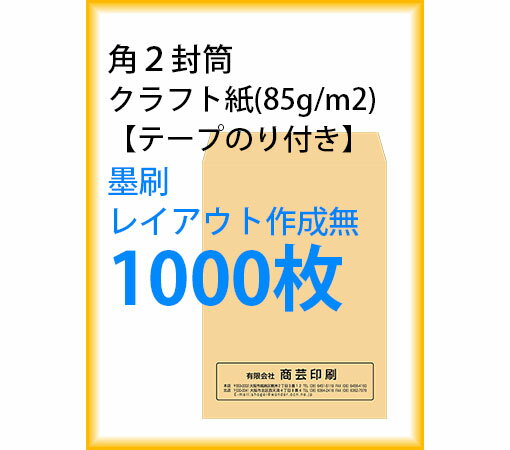 封筒印刷 角2封筒 クラフト紙 テープのり付き 墨刷 レイアウト作成無 1000枚 kaku231112
