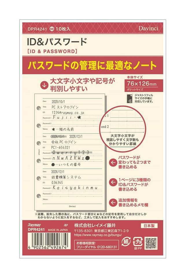 レイメイ藤井 ダヴィンチ ID&パスワードポケットサイズ DPR4241 ミニ6 Raymay システム帳レフィル ビジネス手帳 手帳リフィル システム手帳リフィル