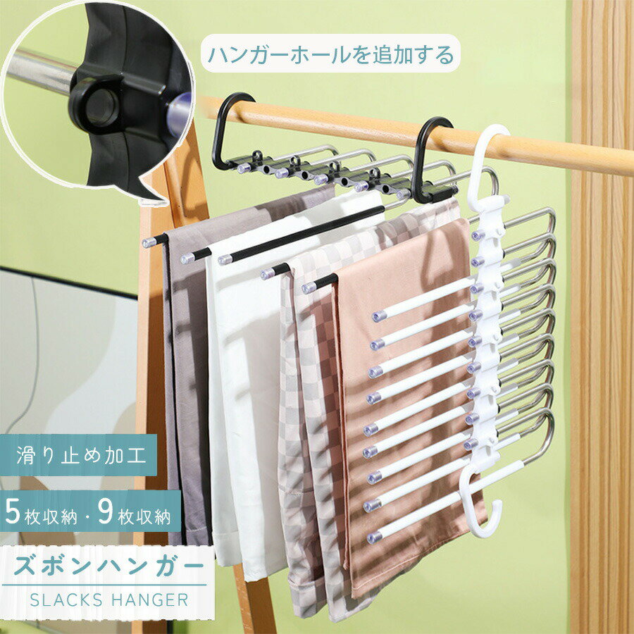 ハンガー ズボンハンガー 2個セット 5連 9連 ハンガーホール搭載 省スペースハンガー 折り畳み スラックスハンガー パンツハンガー 5枚 9枚 ハンガーラック スリム ステンレス 縦掛け 横掛け 強力 丈夫 スライド式 フック クローゼット収納 滑り止め ジーンズハンガー