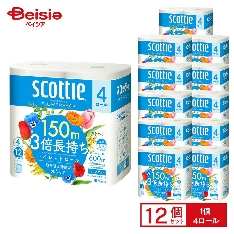 【4個セット】スコッティ トイレットペーパー 3倍 スコッティ フラワーパック 3倍長持ち トイレットロール 150m 12ロール(シングル) 14012スコッティ トイレットペーパー トイレットロール 長巻 長尺 3倍 長持ち コンパクト シングル 150m【iris_dl03】
