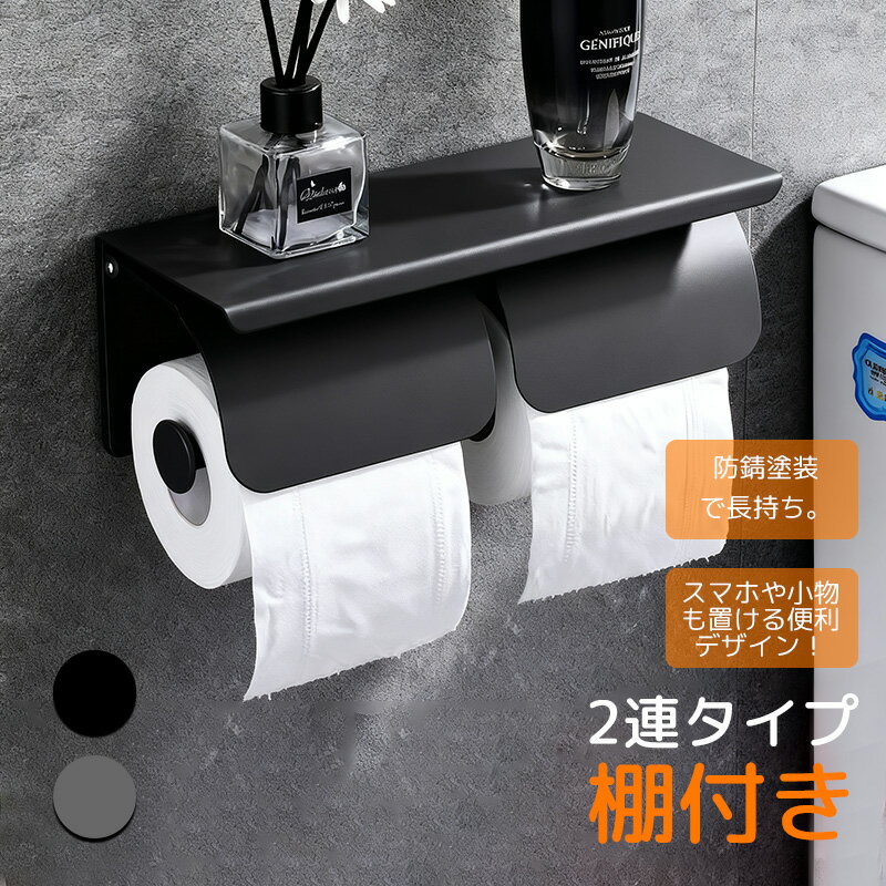 【15%OFF★24H限定】トイレットペーパーホルダー 2連 ダブル 棚付き 収納 飾り棚 カバー モダン シンプル DIY 後付け おしゃれ ブラック グレー 黒 ブラック トイレラック トイレ収納棚 防汚 お掃除簡単 防錆加工 省スペース トイレ用 事務所 オフィス用