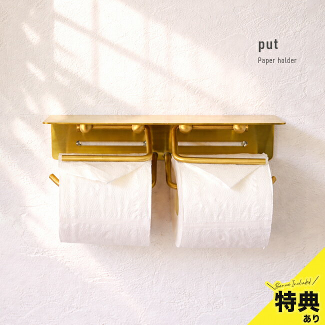 \特典あり/put ペーパーホルダー ダブル ブラス HS3499[トイレットペーパーホルダー 真鍮 ゴールド おしゃれ 2連 カバー シンプル 棚付き トイレットペーパー 2個 ダブル 紙巻器 トイレ収納 台 壁付け]