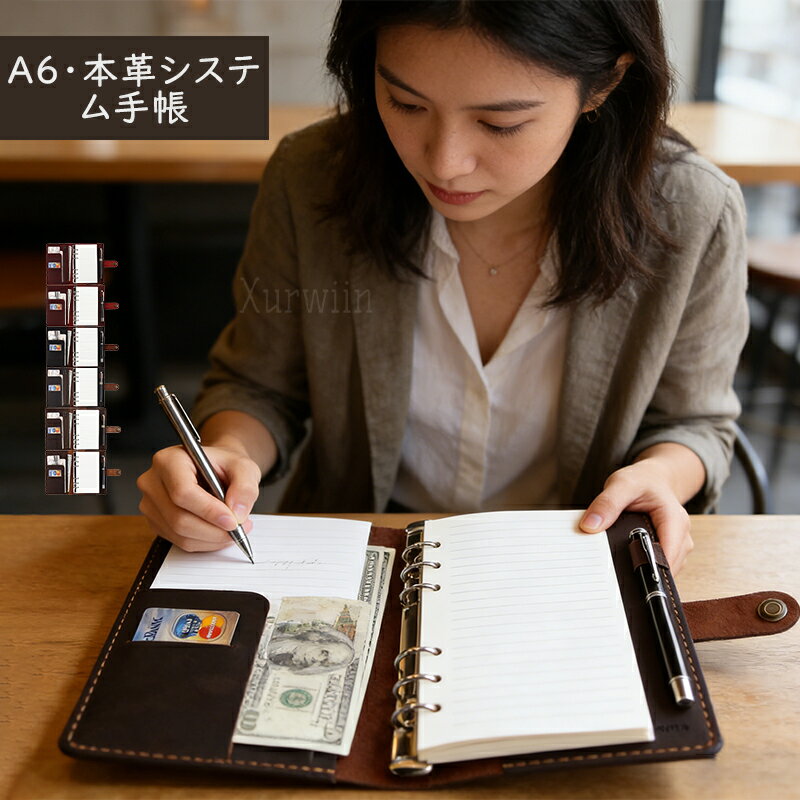 【15%OFFクーポン配布中!】システム手帳 A6 革 6穴 リフィル付き ルーズリーフ スタンダード カバー付き レザー 手縫い オリジナル 3色 ノート メモ帳 カード収納 ビジネスオフィス用品