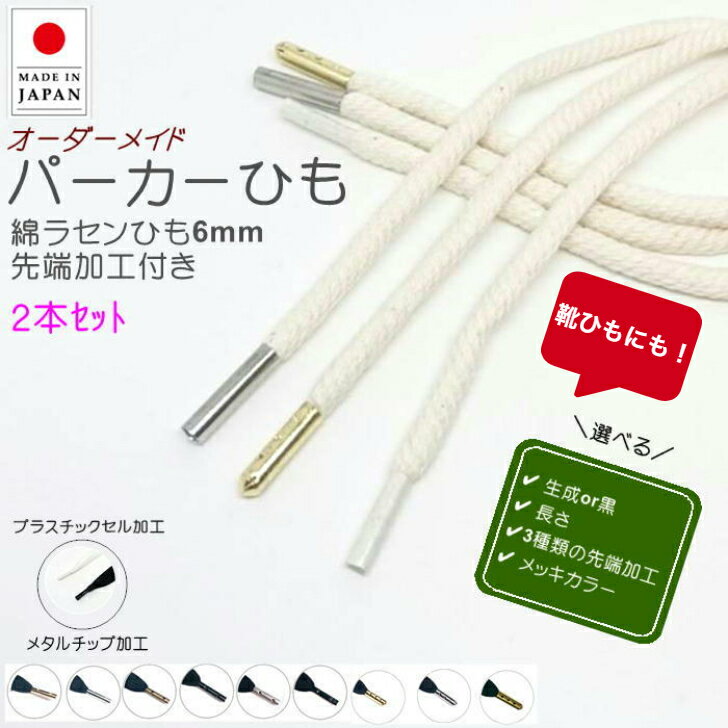 【2セット以上で20%OFF】作れる パーカー紐 靴紐 綿江戸打 先加工付き 2本セット ( ひもカラー16色 加工3種 選べる長さ )綿丸ひも6mmプラスチックセル 筒形メタル 弾丸メタル メッキカラー6 色