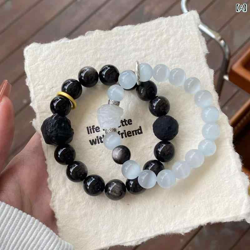 ビーズ アクセサリー シルバー オブシディアン キャッツアイ クリスタル ブレスレット 男女兼用 ライオン ラッキー ビーズ カップル ペア ギフト
