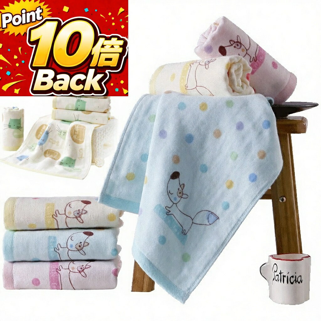 【P10+7%OFFクーポン】 ガーゼタオル 3枚セット フェイスタオル 綿100% 吸水 速乾 薄手 28×52cm キッズ 子供用 かわいい 水玉柄 いぬ柄 ねこ柄 ガーゼ コットン ギフト 圧縮発送 メール便 軽量 洗面所 新生活 引越し対応