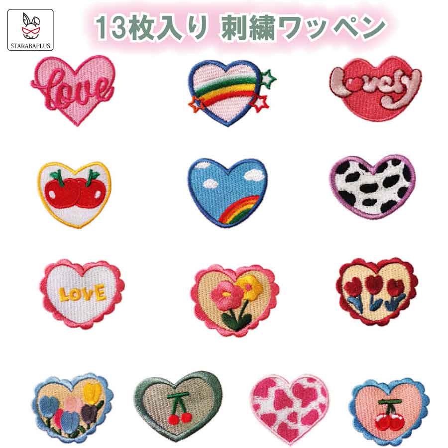 「★3点で20%OFF&10倍」13枚入り 刺繍ワッペン アップリケ アイロン 刺しゅうパッチ かわいい ハート 補修パッチ 膝補修 肘補修 縫い付け 洋服 手袋 帽子 かばん 手芸 手作り DIY 飾りアクセサリー 子供 女の子 男の子 メール便 送料無料