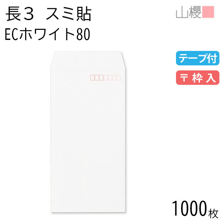 【SALE限定10%OFF!】[ケース販売] 山櫻 封筒 長3 スミ貼 ECホワイトCoC 紙厚80g テープ付 〒枠入 1,000枚 / A4三折用 スラット 白 無地 郵便番号枠あり 会社 事務用 業務用 書類 社用 ビジネス オフィス 縦長 縦型 00563560-1000