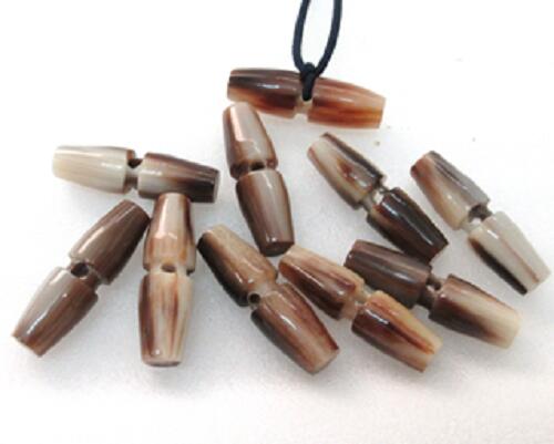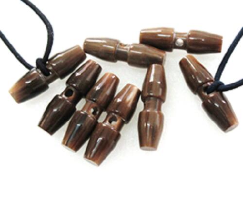 水牛ボタン・9×30mm、槍型。特上濃茶(天然色)。10個(セット)の価格。長さ30m/m・直径9m/m・一つ穴・紐穴の径3m/m・本オランダ水牛の角。紐は付いていません。日本製。ゆうパケット便。