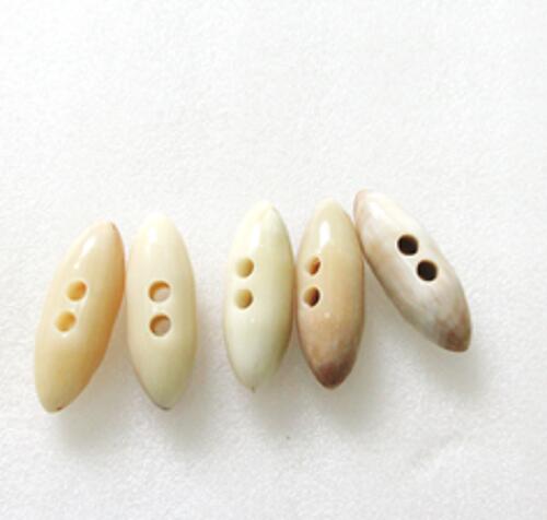 水牛ボタン・長さ30mm、槍型。特上白黒(天然色)。10個(セット)の価格。長さ30m/m・直径9m/m・紐穴の径3m/m・芯持ち・本オランダ水牛角。紐は付いていません。日本製。ゆうメール便。
