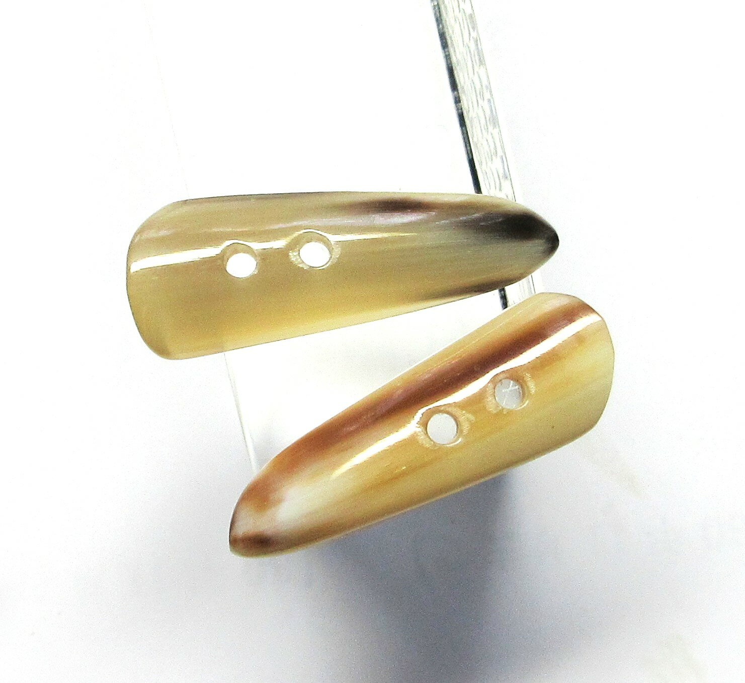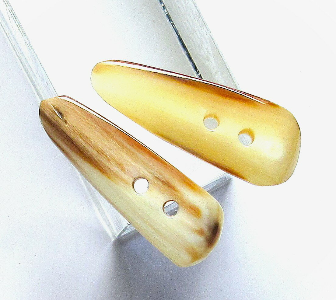 水牛ボタン・40。超高級、特殊半身カットボタン。特上薄茶(天然色)・長さ40m/m・幅14m/m・厚み8mm・紐穴の径3mm。2個(セット)の価格。日本製。ゆうパケット便。