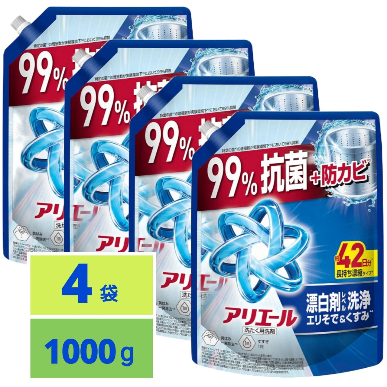 アリエール 洗濯洗剤 液体 漂白剤レベル洗浄 エリそで&くすみ 清潔でさわやかな香り 詰め替え 1000g x4袋セット