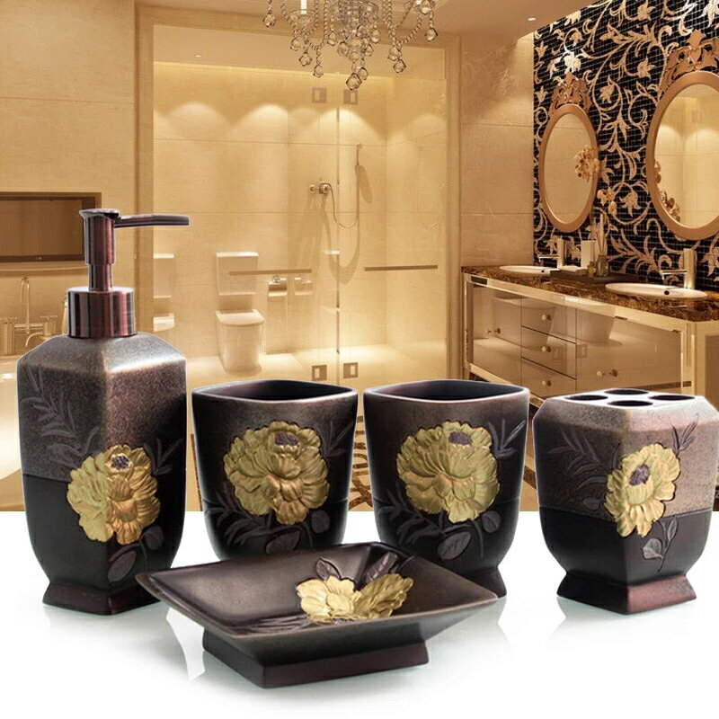 A043974バスルームセット 5点セット ソープディスペンサー 歯ブラシスタンド 石鹸置き コップ 洗面用具~