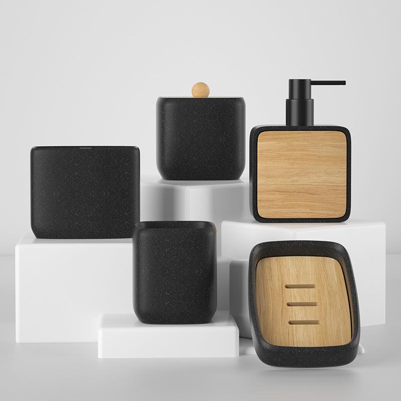 バスルームセット 洗面用品 5点セット 樹脂製 洗面用具一式 ホテル 旅館 浴室備品 ディスペンサー タンブラー 歯ブラシスタンド ソープディッシュ おしゃれ シンプル 北欧風 モノトーン ブラック ホワイト(x500)