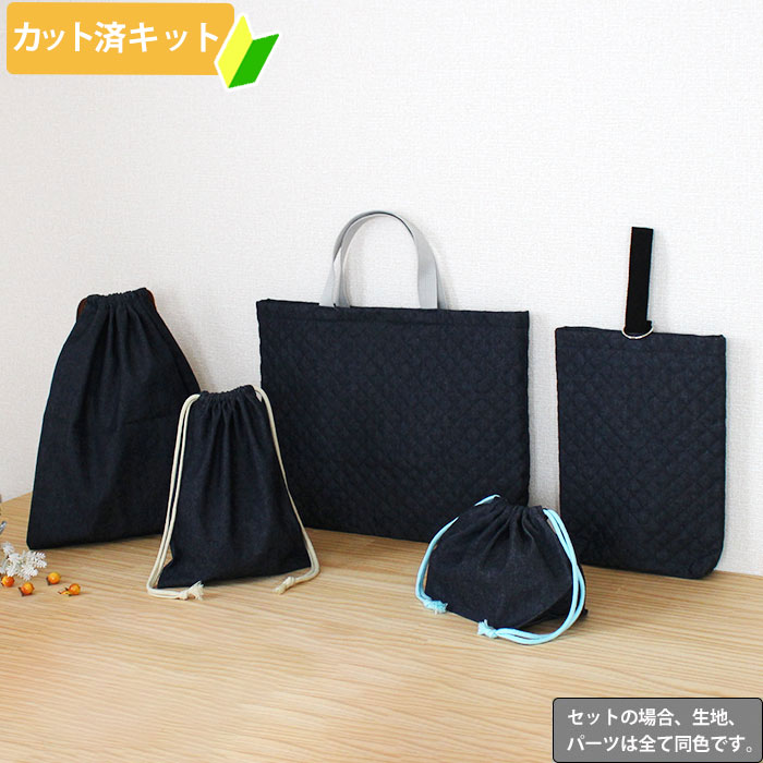 [カット済]インディゴ・デニム【お得な入園入学セット】3点 5点 手作りキット キルティング生地 男の子 女の子 簡単 オーダー 生地 レッスンバッグ シューズバッグ 体操服袋 お弁当袋 給食袋 袋物 巾着 作り方付き 初心者 手芸キット 入園 準備 保育園 テッテ