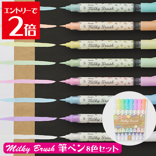 \半額/ ぺんてる 筆ペン パステルカラー筆ペン Milky Brush ミルキーブラッシュ 8色セット Pentel ぺんてる 重ね塗りができる 毛筆タイプの穂先 画材 送料無料 Atelier memi アトリエメミ