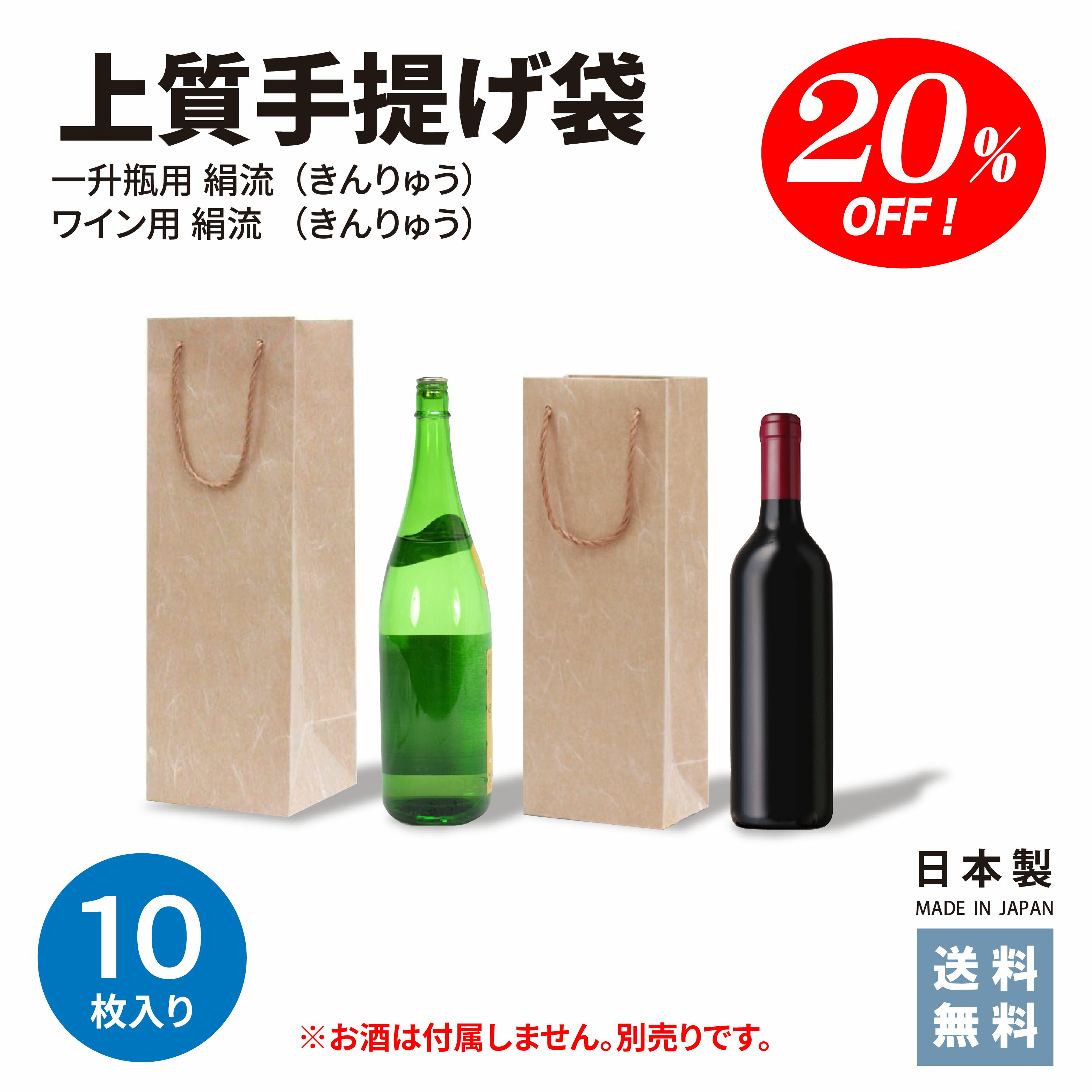 【20%OFF☆スーパーSALE】【送料無料】上質手提げ袋 一升瓶用・ワイン用 絹流 (きんりゅう)10枚セット 日本製 紙袋 袋 上質 手持ち 絹 贈答 贈り物 ギフト 手提げ ★楽天1位★ 正月 大晦日 帰省