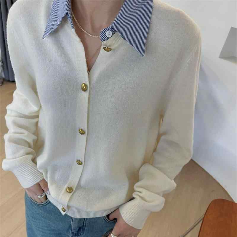 ニット カーディガン レディース 羊毛 トップス 秋冬 ストライプ シャツ襟 セーター プルオーバー 金属ボタン おしゃれ 上着 通勤着 オフィス カジュアル かわいい 白 黒 グレー