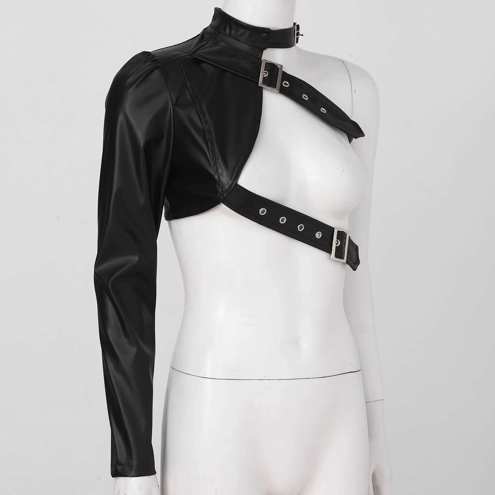 パンクショルダーアーマー 女性のワンショルダー長袖ナイントップバーロールプレイングファッション調節可能な金属ボタン PU レザー不規則なジャケット コスプレ衣装 (色 : Black, Size : M)
