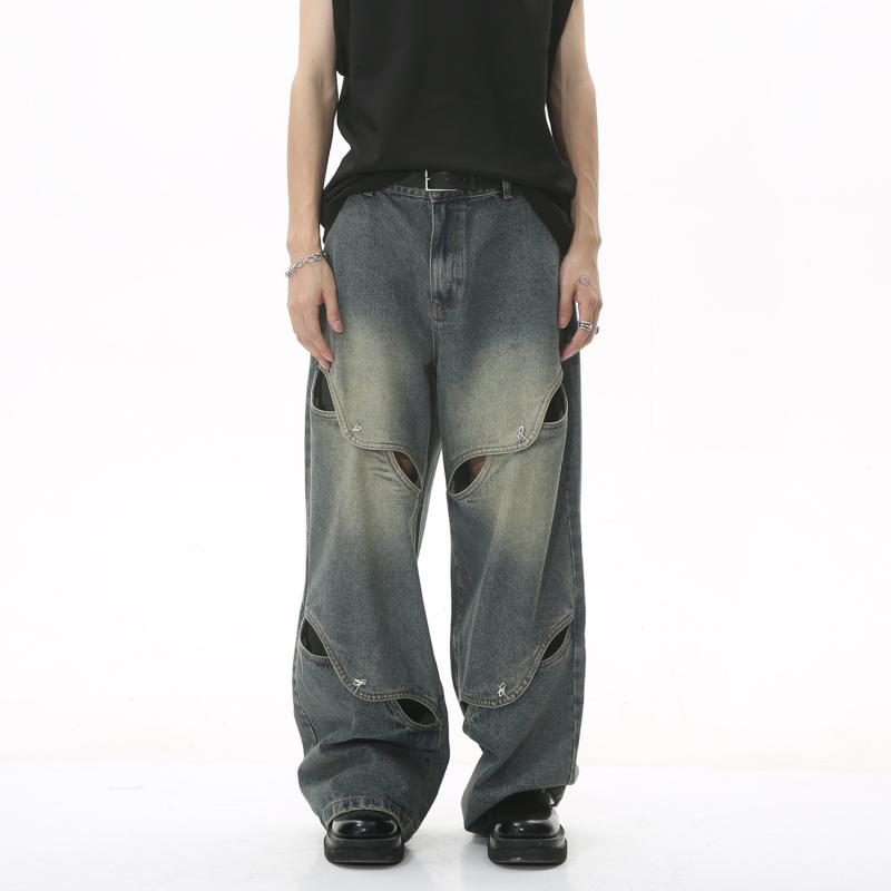 デニムパンツ メンズ 金属ボタン 凝ったデザイン カットアウト ワイドシルエット ルーズフィット ミドルウエスト ジップフライ 綿混 韓国ファッション 春夏 カジュアル