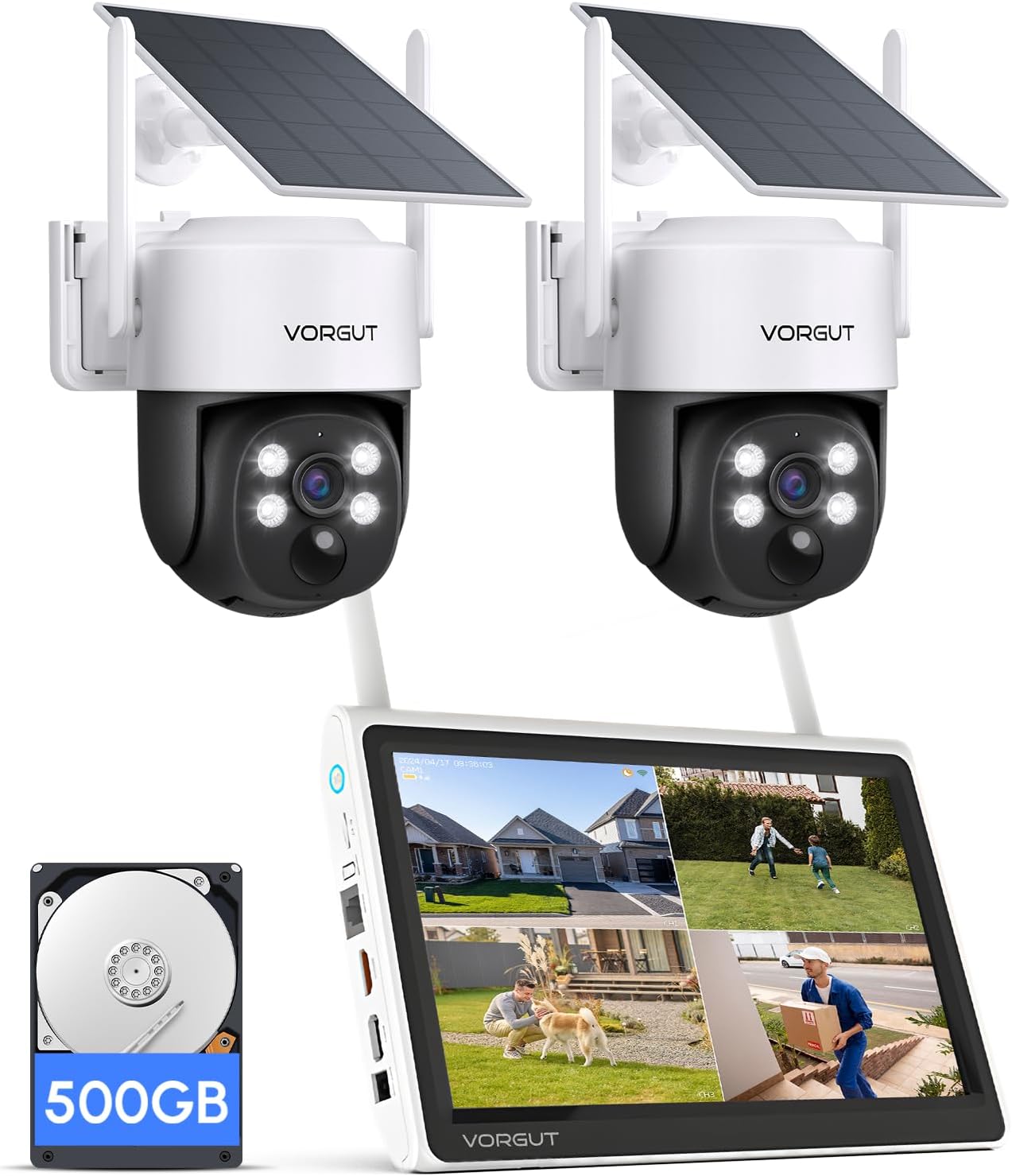 VORGUT 防犯カメラ 屋外 ソーラー 2台セット モニター付き 400万画素 工事不要 電源不要 PIR人体検知 音声威嚇 2.4G&5G WiFi対応 5年保証 無線防犯カメラ IP66防水防塵 警報通知 屋外防犯対策 (防犯カメラ 2台+モニター+500G HDD内蔵)