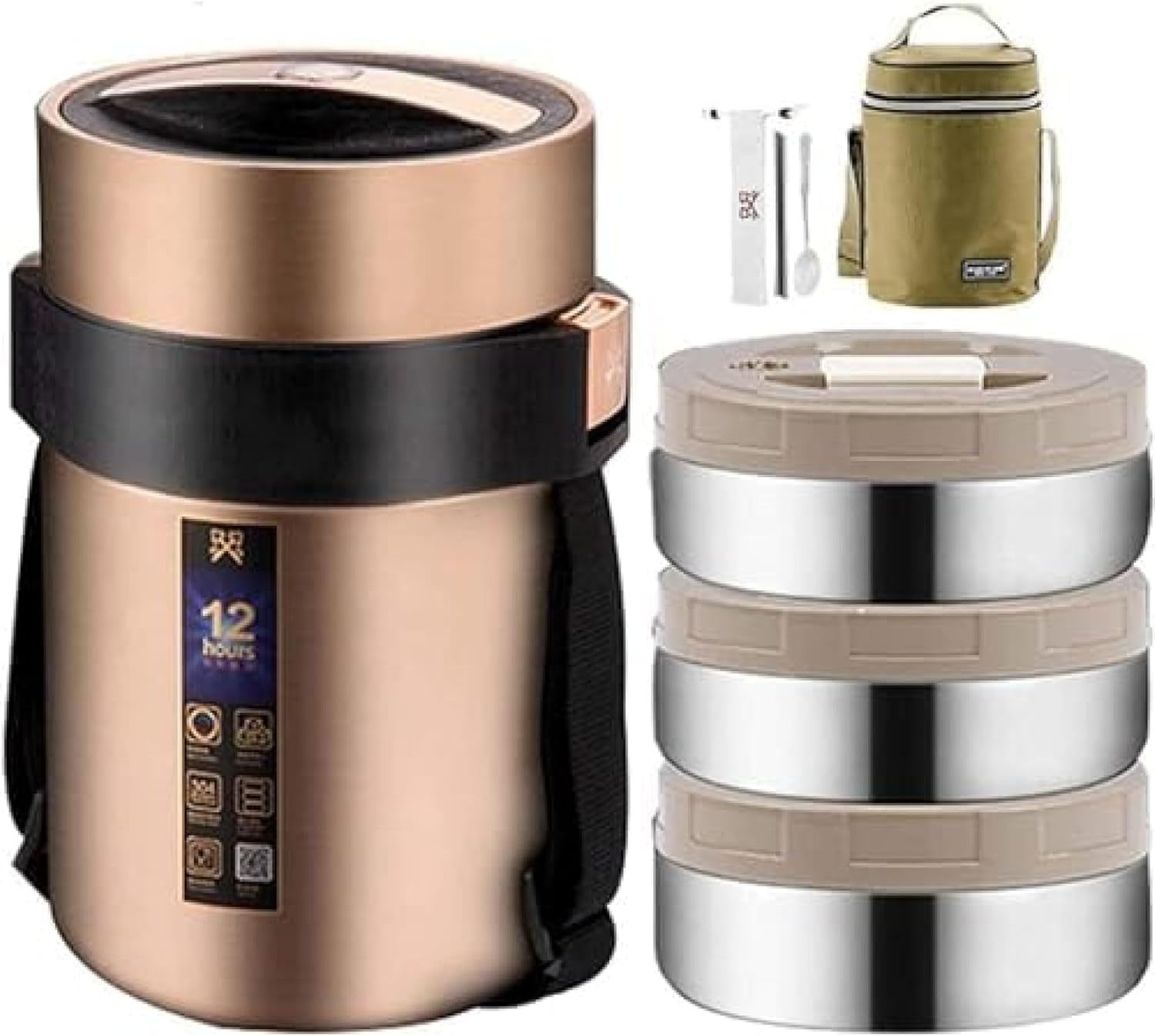 ランチジャー 保温弁当箱 真空304 大容量 ステンレス 保温ランチジャー フードジャー ポータブルお弁当箱 食器と収納バッグ付き ランチボックス フードコンテナ 12時間の保温 ゴールデン
